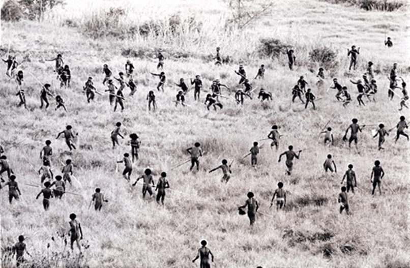 يېڭى گىۋىنىيەدىكى ئىككى يېزا قەبىلىسى ئوتتۇرىسىدىكى جەڭ (1960). بۇ كۆرۈنۈش يېزا ئىگىلىك ئىنقىلابىدىن كېيىنكى نەچچە مىڭ يىلدا ئومۇميۈزلۈك مەۋجۇت بولغان كۈرەشنى ئەكس ئەتتۈرۈپ بېرىشى مۇمكىن.